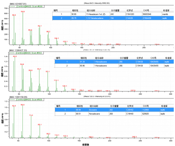 圖2.3 三重峰的質(zhì)譜圖(圖2.2中8.6~8.9 min)經(jīng)NIST2014庫確認(rèn)