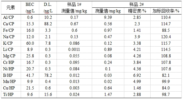 參考《GB/T 32650-2016 電感耦合等離子體質(zhì)譜法檢測石英砂中痕量元素》進(jìn)行樣品前處理。利用冷焰模式及標(biāo)準(zhǔn)模式對(duì)樣品進(jìn)行測試,考察背景等效濃度(BEC)、方法檢出限(D.L.)、加標(biāo)回收率、精密度。背景等效濃度在0.6ng/L~60.0ng/L之間,方法檢出限在0.3ng/L~88.2ng/L之間,加標(biāo)回收率在82.1%~120.4%之間,精密度在1.41%~6.92%之間。