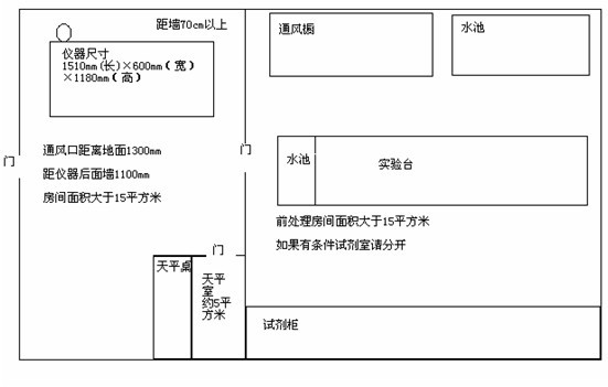 ICP-2000型ICP掃描光譜儀的外形尺寸為1510mm(長)×600mm(寬)×1180mm(高),重量為300kg ,發(fā)貨時四角裝有減震器,儀器運到用戶后卸下減震器,換上螺絲桿,當儀器選好位置后,將螺絲桿旋出使四角輪懸空,調(diào)節(jié)螺絲桿使儀器至水平,為保持儀器性能穩(wěn)定及便于維護,ICP-2000 周圍必須留出供維護人員維護儀器所需的空間(安裝臺距后面墻面至少70cm)