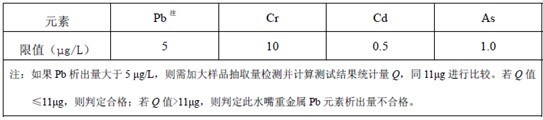 (3)HJ/T 411-2007《環(huán)境標志產(chǎn)品技術(shù)要求 水嘴》主要對鎘、鉛、鉻、砷四種重金屬元素的析出量予以限定,限定要求如表3所示:
