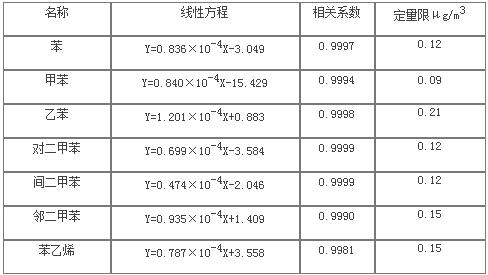 7種苯系物在進(jìn)樣量1-320ng范圍內(nèi)線性相關(guān)系數(shù)為0.9981-0.9999,線性關(guān)系良好。以響應(yīng)信號(hào)為基線噪聲10倍時(shí)對應(yīng)的進(jìn)樣濃度作為定量限,確定物質(zhì)的定量限均小于0.21μg/m3。