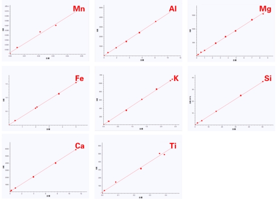 設(shè)定適當(dāng)?shù)臏y量條件,使用X射線熒光光譜儀掃描一系列含量已知的石墨標(biāo)準(zhǔn)物質(zhì)或石墨二次標(biāo)樣,該系列樣品中需關(guān)注元素Mg、Al、Si、K、Ca、Ti、Mn、Fe等元素含量與強(qiáng)度的一次線性校正工作曲線。然后,對(duì)未知石墨樣品進(jìn)行測量。