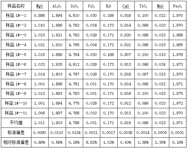 圖3為石墨1#樣品的X射線熒光譜圖,從譜圖可知,樣品的含有少量Mg、Al、Si、P、K、Ca、Ti、Mn、Fe等元素。使用該樣品進(jìn)行重復(fù)性測試之后,檢測結(jié)果中計(jì)算了對(duì)應(yīng)元素的氧化物含量,測試結(jié)果中呈現(xiàn)出較好的重復(fù)性。