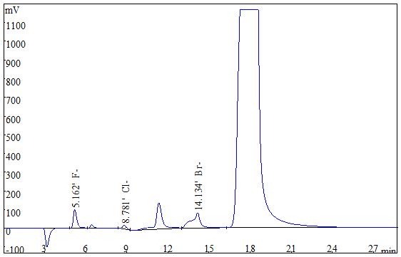 準(zhǔn)確稱取0.2g(精確至0.0001g)試樣,采用氧彈燃燒后冷卻定容,經(jīng)0.22μm的水系濾膜過濾后上機(jī)得到測試譜圖如下圖2、圖3所示。