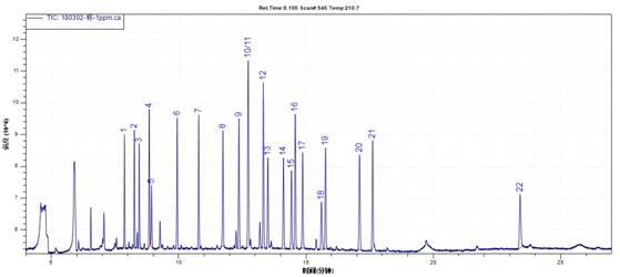 測(cè)定方式:TIC(FULL SCAN)定性(掃描范圍:45-450amu),SIM模式定量。