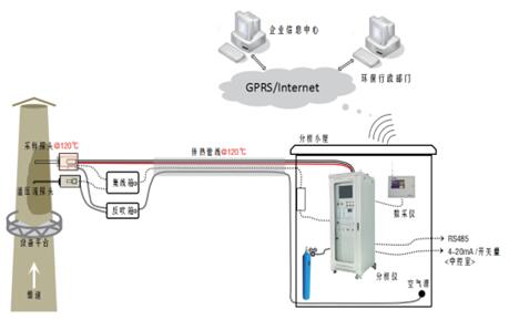采樣探頭安裝于企業(yè)廢氣排口,排口被測廢氣被負(fù)壓抽泵抽取進(jìn)入采樣探頭探桿(不加熱),經(jīng)過陶瓷濾芯進(jìn)入伴熱管線(伴熱溫度可設(shè)置),樣氣在伴熱管中繼續(xù)傳輸至預(yù)處理系統(tǒng),在預(yù)處理系統(tǒng)經(jīng)過二級過濾和分流后按照一定流量送至在線氣相色譜儀(GC-FID)。在線氣相色譜儀控制內(nèi)置自動取樣平面十通閥和定量環(huán)系統(tǒng)取1mL的被測樣氣,借助載氣送入色譜柱分離和FID做定性、定量分析。分析結(jié)果通過工控機(jī)保存,并和排氣筒監(jiān)測排放參數(shù)一起通過數(shù)采儀送至環(huán)保監(jiān)控平臺。